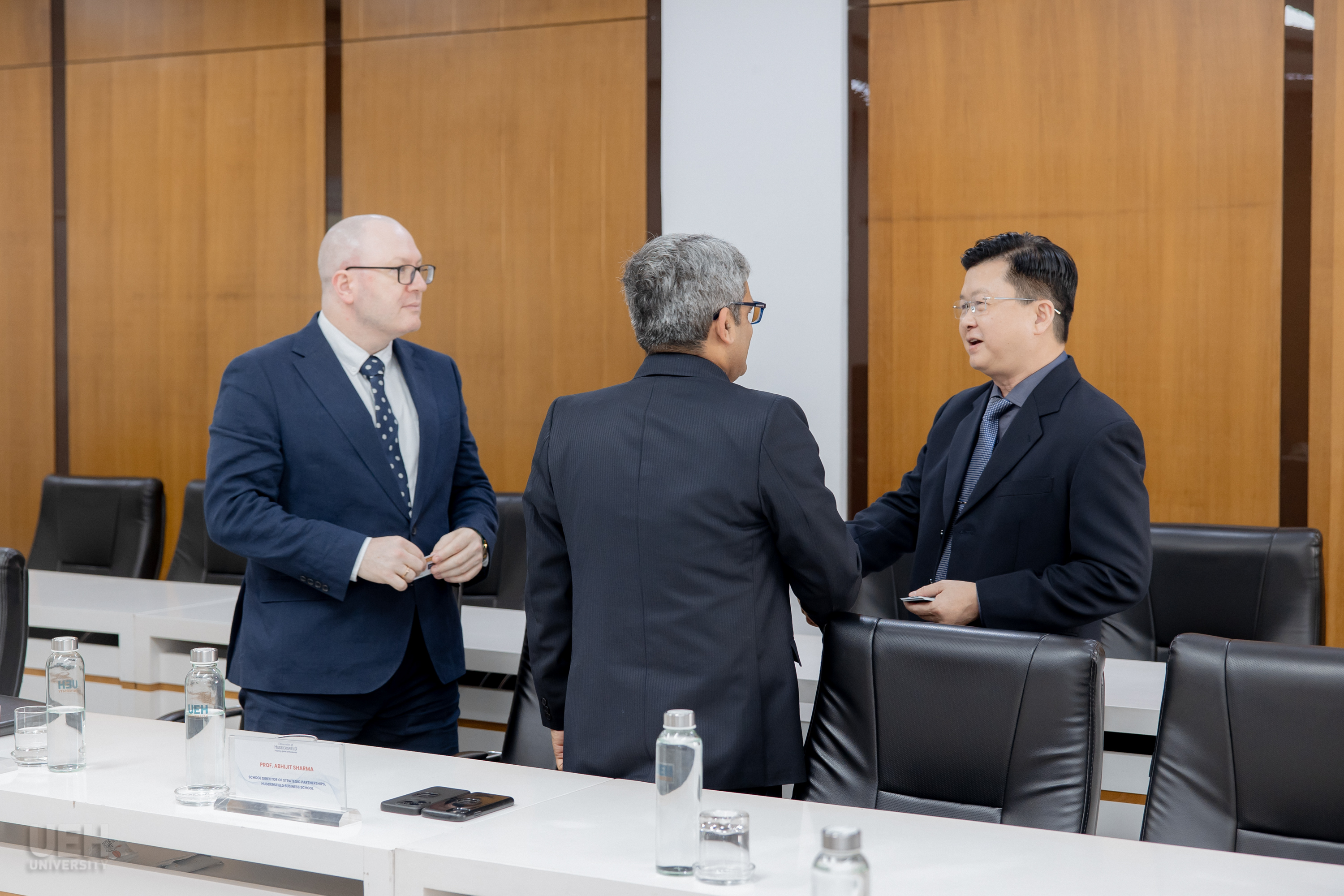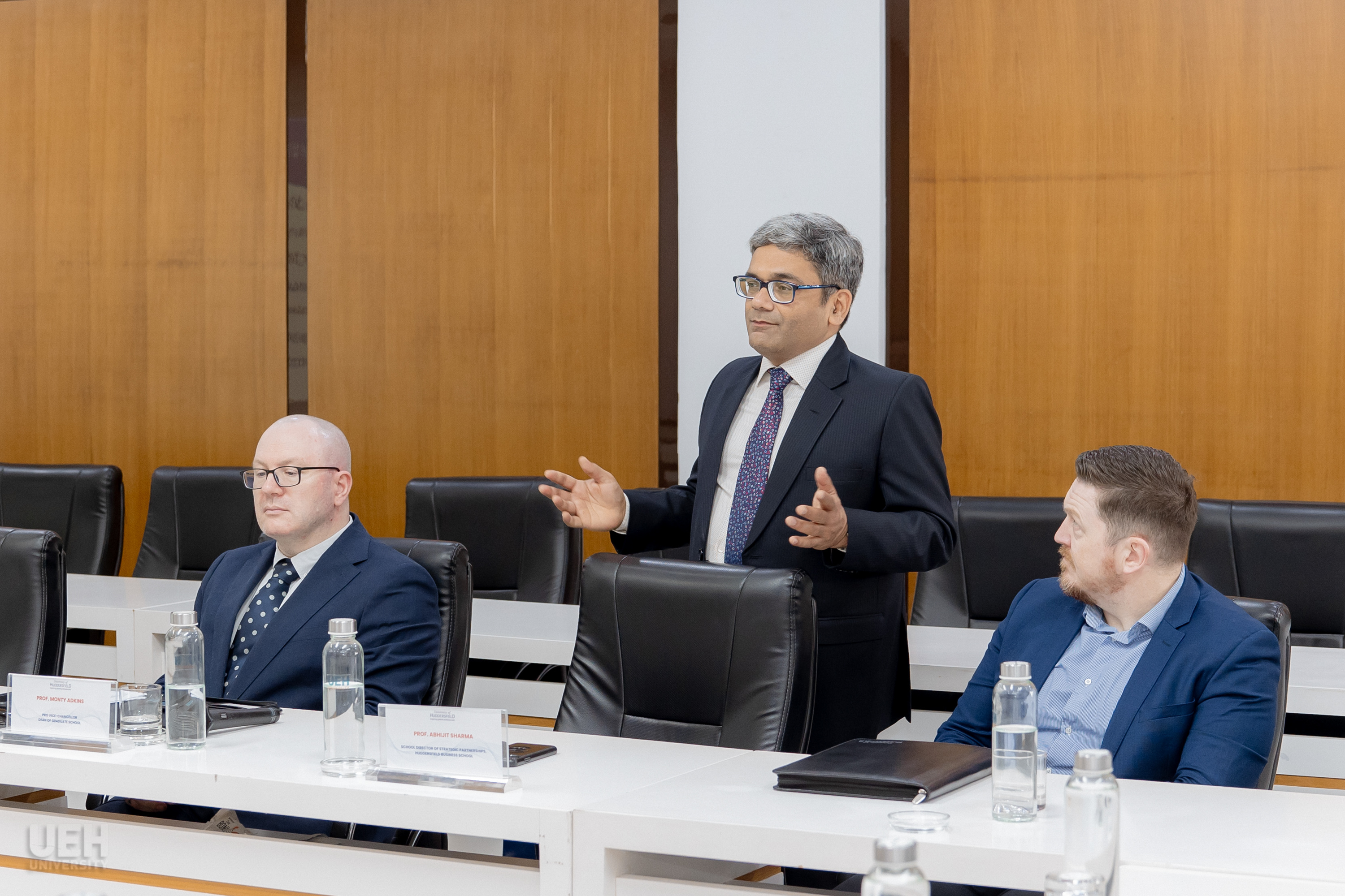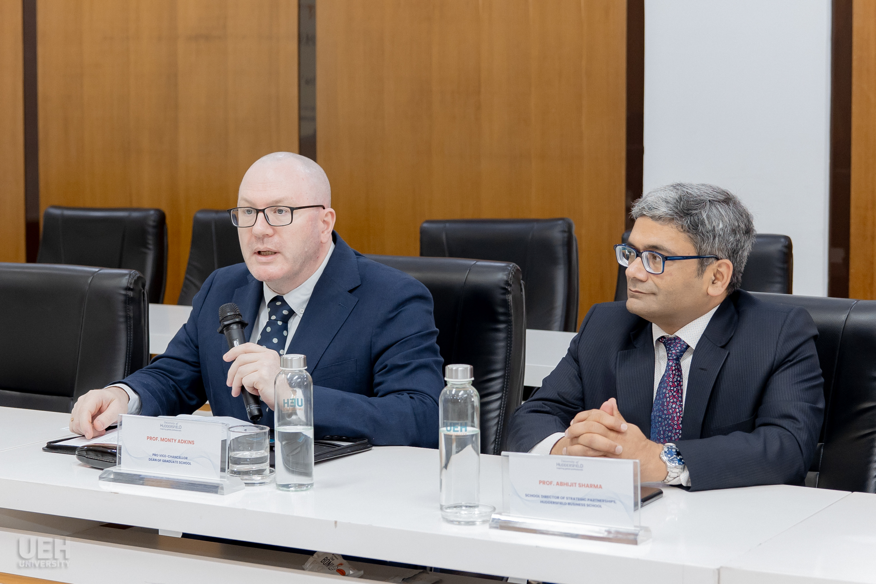 Về phía đối tác Đại học Huddersfield, buổi lễ vinh dự đón tiếp GS. Monty Adkins - Phó Giám đốc phụ trách Nghiên cứu, Đổi mới và Trao đổi tri thức kiêm Trưởng Ban Sau Đại học và GS. Abhijit Sharma - Giám đốc Chương trình Đào tạo Sau đại học.