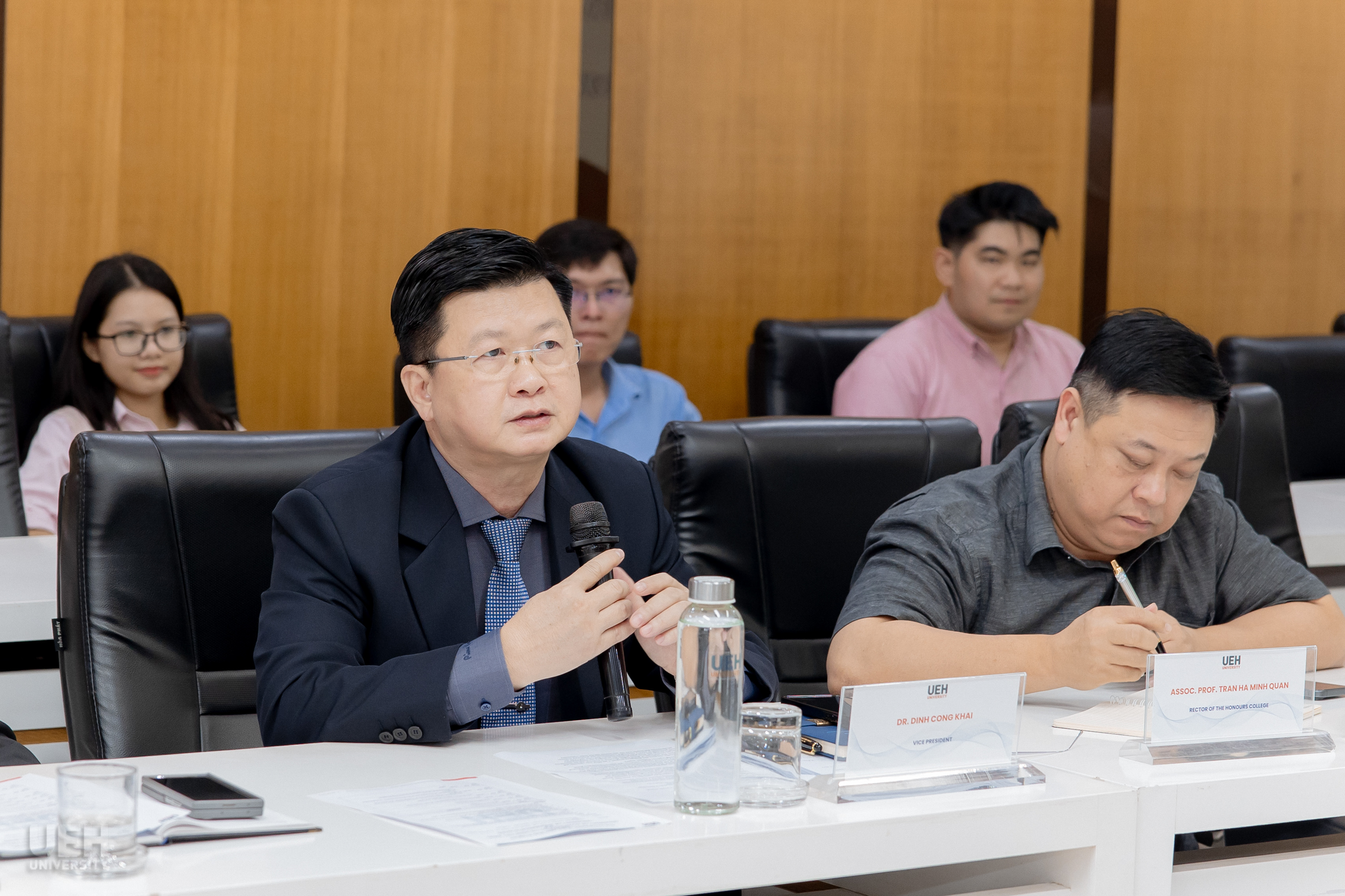 Phát biểu khai mạc, TS. Đinh Công Khải - Phó Giám đốc UEH nhấn mạnh: "Lễ giới thiệu Chương trình Đào tạo Tiến sĩ liên kết giữa UEH và Đại học Huddersfield hôm nay là minh chứng rõ ràng cho quyết tâm của UEH trong việc triển khai chiến lược quốc tế hóa, phát triển đại học đa ngành, hướng đến chuẩn mực bền vững và hội nhập quốc tế sâu rộng. Đây là cột mốc quan trọng góp phần củng cố vị thế học thuật của UEH trong mạng lưới giáo dục toàn cầu, đồng thời mang đến cơ hội tiếp cận nền giáo dục tinh hoa của Anh Quốc ngay tại Việt Nam."