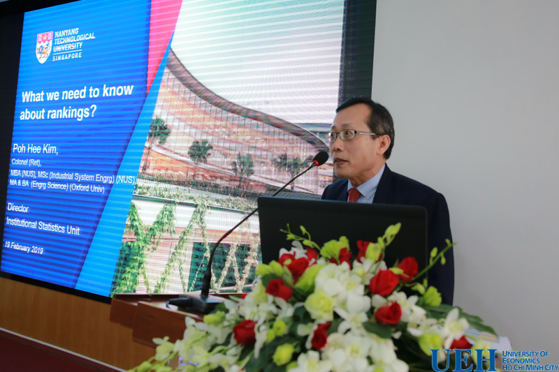 Tại Hội thảo, GS. Hee Kim Poh giới thiệu tổng quan về các bảng xếp hạng đại học uy tín trên thế giới, định nghĩa các tiêu chuẩn của QS AUR, kinh nghiệm từ NTU đối với xếp hạng đại học, cách thức quảng bá và xây dựng thương hiệu của một trường đại học để có thứ hạng cao trong hệ thống xếp hạng đại học uy tín, mức độ phân bổ các chỉ tiêu và các góp ý đề xuất để chuẩn bị tốt hơn cho quy trình đăng ký xếp hạng Đại học.