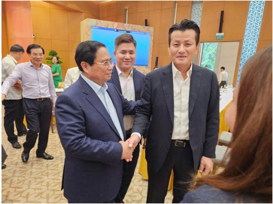 Prime Minister Pham Minh Chinh and Mr. Park Se Yeol, General Director of Orion Food Vina, at the “Transformation to Smart Factories on a National Digital Platform” program. Source: Orion Food Vina